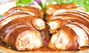 這道菜顏色誘人,做法也不會(huì)特別復(fù)雜。只要以豬手為原料,在傳統(tǒng)的鹵水上加入普洱茶葉,浸鹵2個(gè)小時(shí)而成。據(jù)何劍峰說(shuō),茶葉含有茶堿,茶堿能去肥膩,也增加了肉質(zhì)的爽滑度。