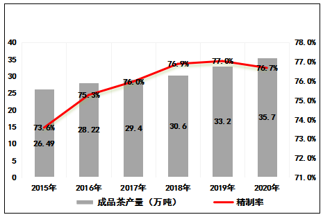 圖3 2015-2020年云南省成品茶產(chǎn)量趨勢(shì)圖及精制率變化圖