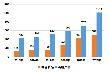 圖10  2015-2020綠色食品及有機(jī)產(chǎn)品數(shù)和組織數(shù)比較圖