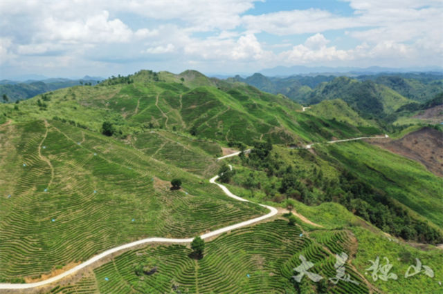 產(chǎn)業(yè)路下方,20來名群眾正在躬身勞作,下苗、覆土,一株株茶苗便種植完成。剛種下的低矮茶苗,與產(chǎn)業(yè)路上方郁郁蔥蔥的茶山形成強烈反差。