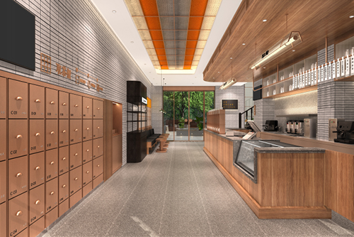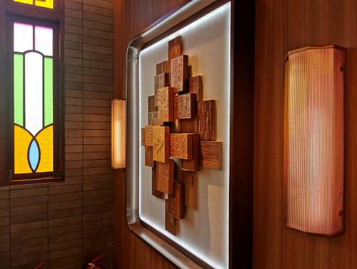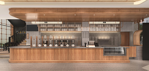 水吧區(qū)域的木紋理與天然石材構(gòu)造傳統(tǒng)茶樓氛圍,以新延舊的方式來(lái)設(shè)計(jì)水吧區(qū)域。